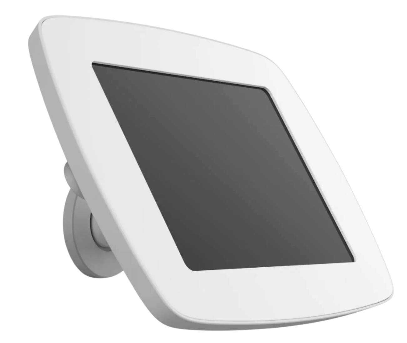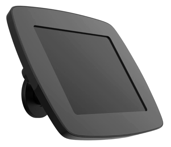 The lockable enclosure keeps the tablet secure while allowing it to be mounted in either portrait or landscape orientation. Internal cable routing keeps the charging cable hidden, and the compact wall arm positions the tablet at a fixed angle for easy interaction in busy environments.